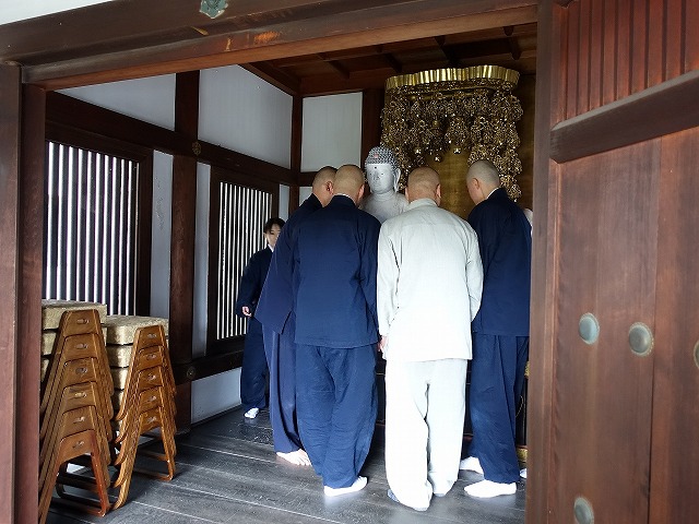 法要は午後から開始ですので、午前中に準備を行いました。まずは大殿を改めて掃除し、骨仏を安置させていただく台座を設置します。準備が整うと、いつもは納骨堂に安置されている骨仏を大殿へとお移しするのですが・・・、この仏様・・・、大変重たいのでございます。