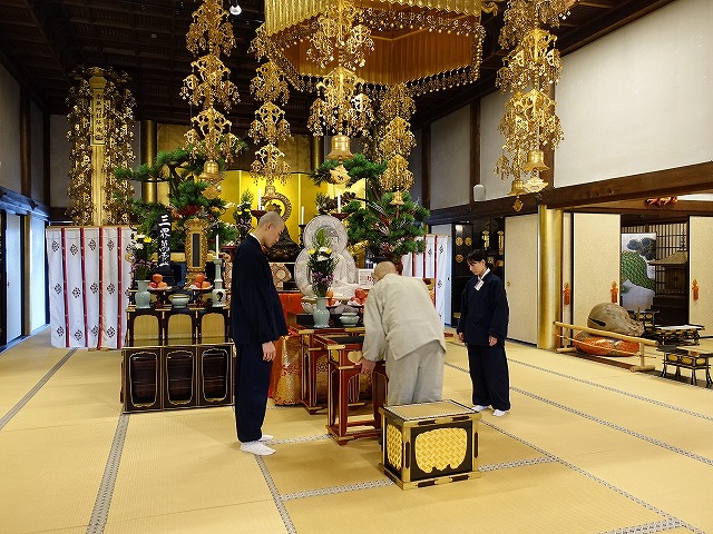 さて、法話が終わると骨仏法要が始まります。別科生も上人方と一緒にお勤めに参加いたしました。いつも朝の勤行で使用させて頂いている大殿での法要だからでしょうか、良い声でお唱えできていましたし、所作も綺麗に揃っていました。日頃の修練のたまものですね。
