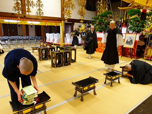 法務部の職員さんの指示に従い、法要に必要な仏具などを確認します。