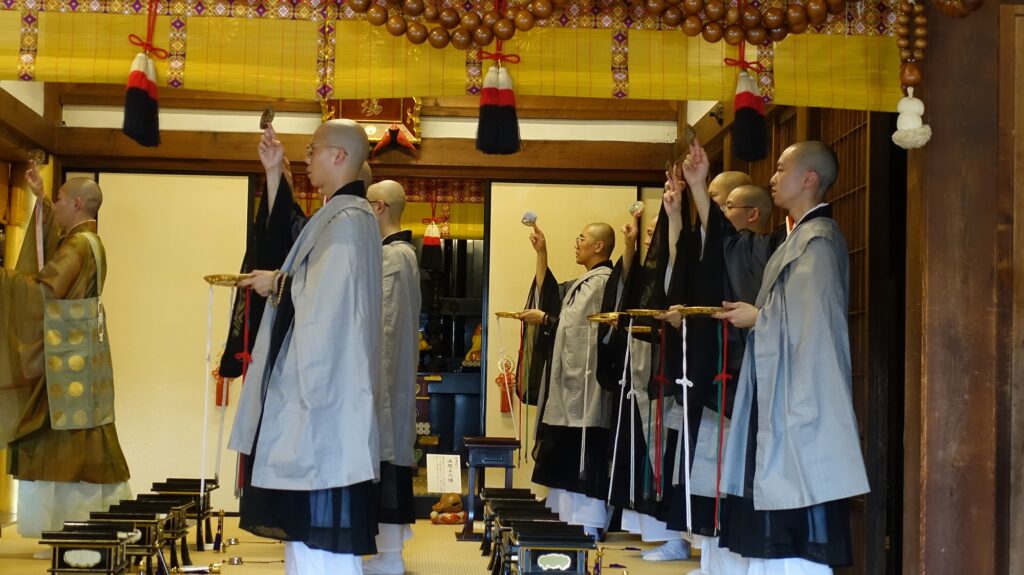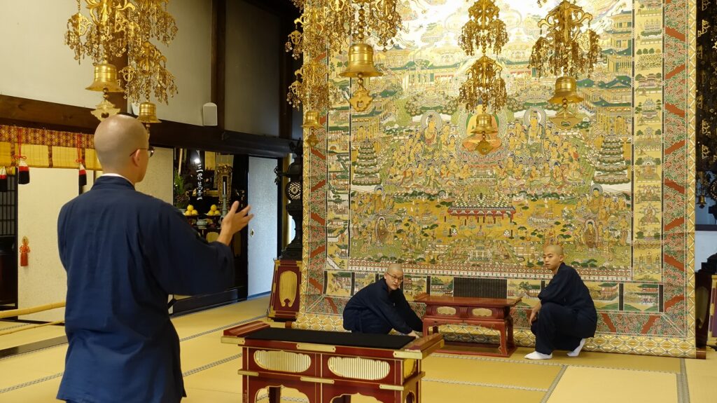 2年生は総本山知恩院にて、1週間の彼岸実習となります。1年生も2日目から加わります。知恩院では決まりや手順などが清浄華院や浄山道場と異なるため、1年生は2年生からあらかじめ指導を受けて実習に臨みます。