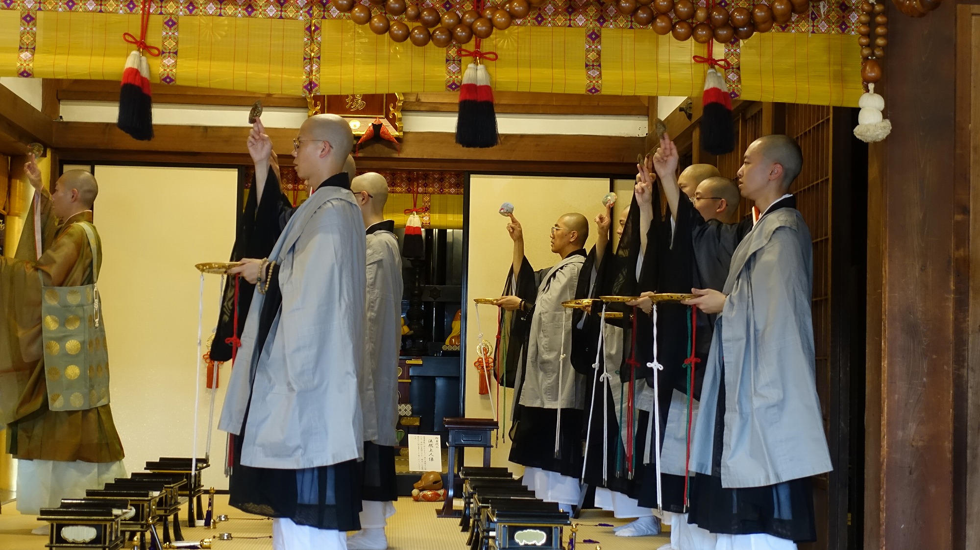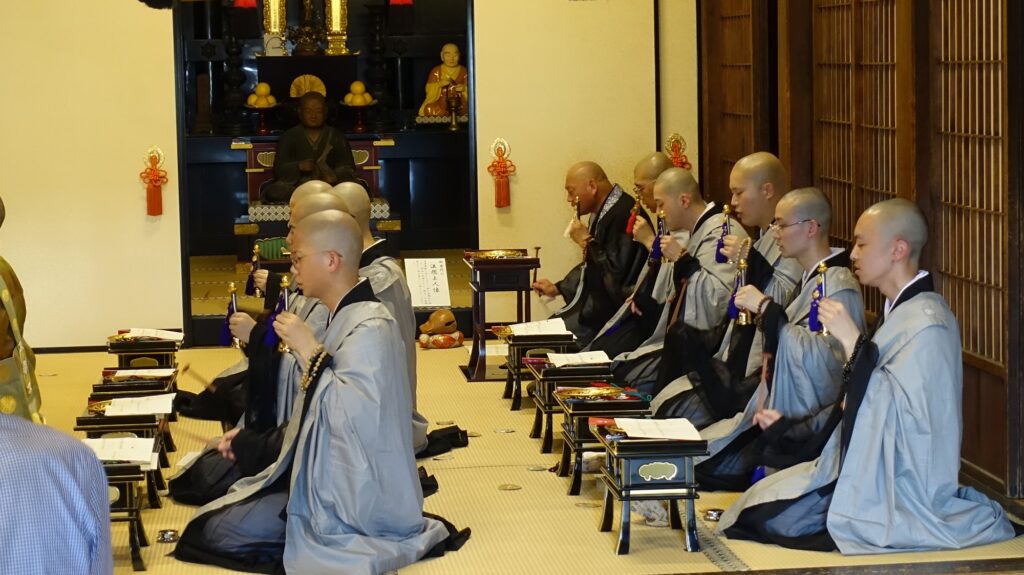 今年度も別科生たちはお彼岸の期間中、知恩院や清浄華院の彼岸会のお手伝いをさせていただきました。1年生は、まず浄山道場がある清浄華院の彼岸実習です。境内の掃除に始まり、御影堂に當麻曼陀羅を掛けるお手伝いなど、さまざまな法要の準備をします。法要中には、詠唱の講義で習った「彼岸和讃」を奉納しました。