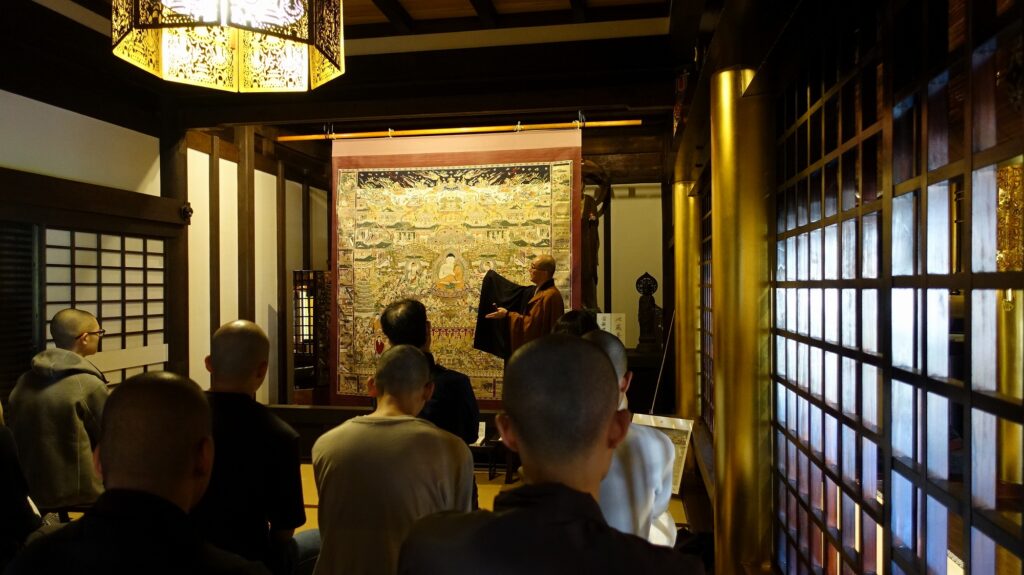 奥院御影堂では『観無量寿経』の内容が描かれた「観経曼陀羅(當麻曼陀羅)」の「絵解き」(絵の各部を指しながら、お経の内容を説明)をしていただきました。毎日朝勤行で『浄土三部経』を輪読しているので、その内容をより理解して日々の朝勤行に臨んでくれたら、指導員としては嬉しい限りです。